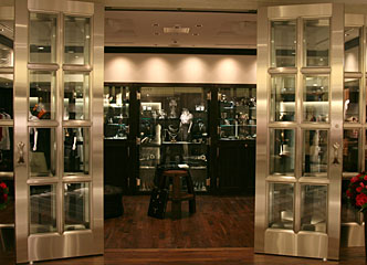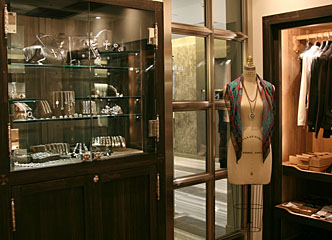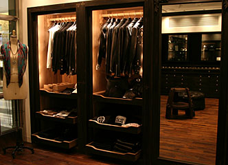 黒檀やウォールナットなど天然木の無垢材を用い、ロサンゼルスの本社工場で作成した内装を、彼ら自身の手で建てつけているクロムハーツのショップ。