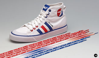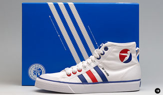 55DSL 15周年記念モデル「XV / 55」は、55DSLのトレードマークカラーにエンジェルロゴと、クールなスタイリングにテクニカルな機能が凝縮されたadidas Originalsの象徴的アイテム、Nizzaモデルとのコンビネーション。