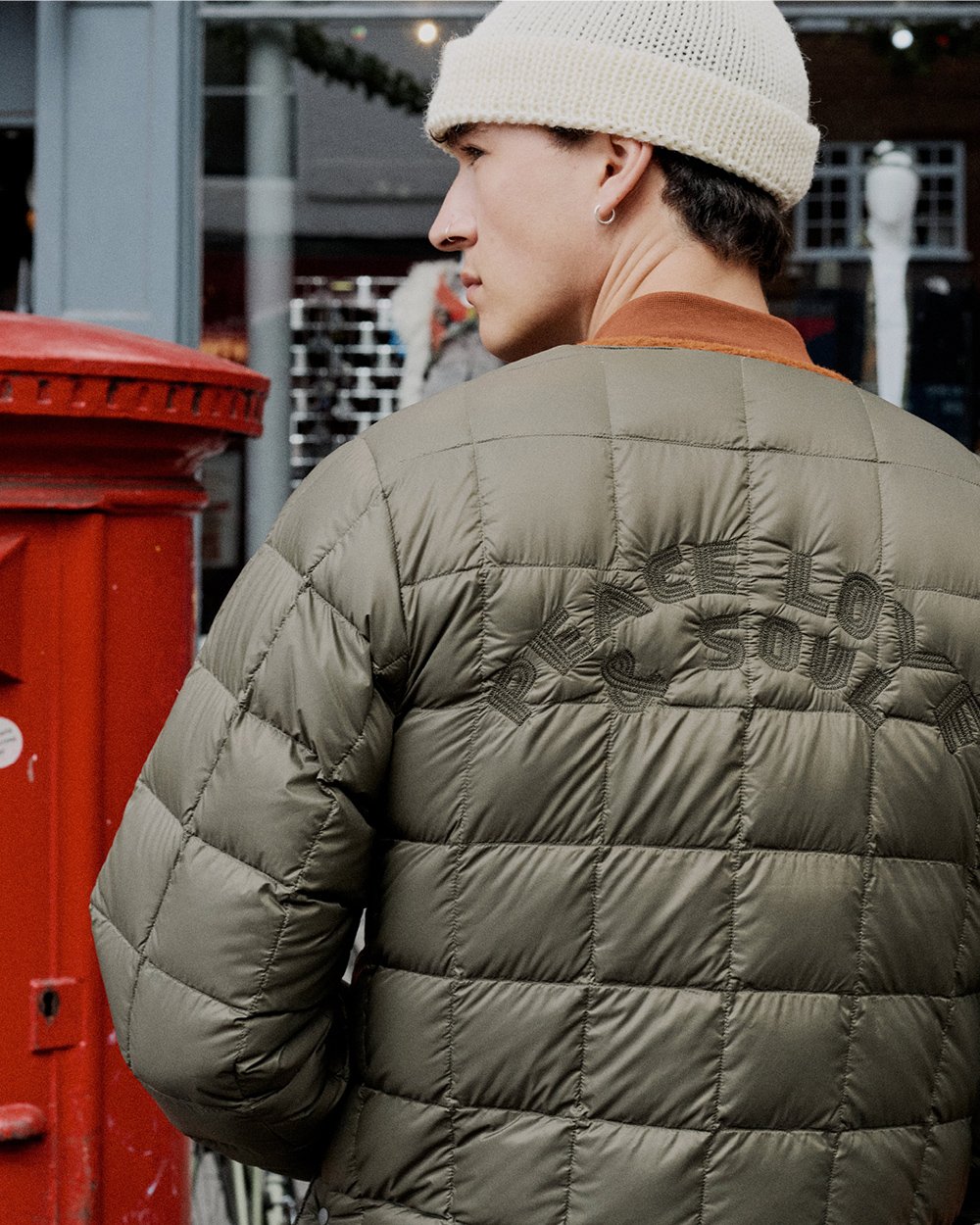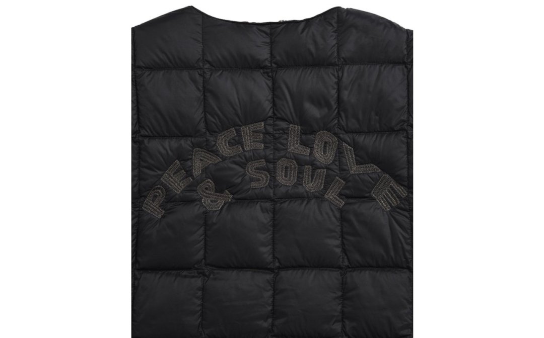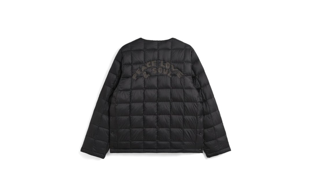 インナーダウンジャケットには、“PEACE LOVE & SOUL”の刺繍があしらわれており、”世界に平和と愛が満ち溢れるように”というメッセージが込められている。