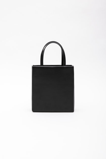 かっちりとしたスクエアフォルムが魅力で、素材には滑らかなカーフスキンを使用。小ぶりのサイジングだがマチ幅も広く、必要なアイテムはしっかりと収納できる。