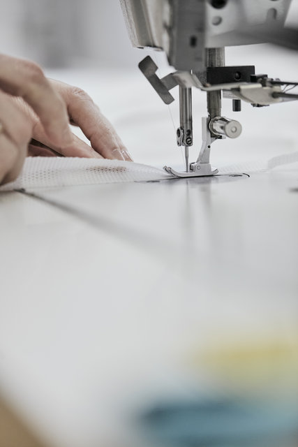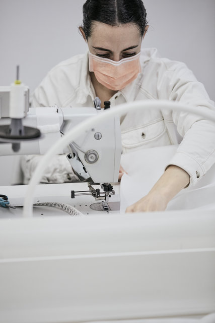 当初は生地の裁断はすべてポン・ヌフ通りのアトリエで手作業により行われていたが、現在は在宅勤務のルイ・ヴィトンのパターンカッターがボランティアとして加わり、同時進行で作業を行っている。4月14日(火)からは、自動裁断機を持つパリのパターンカッターも参加し、生地の裁断がさらにスピードアップ。これにより、ガウンの生産数が大幅に増える見込みだという。