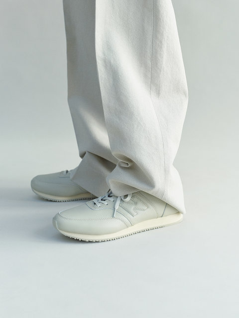 フットウェアは、「COMP100」をもとにコラボレーションモデルを製作。シボ感のあるレザーを使用し、タン、ロゴ、ヒールタブまでワントーンで統一した無駄のないデザインが魅力。タンが通常より少し長めになっているのもポイントだ。ニュアンスのあるライトグリーンと、スモーキーなブラウンの2色展開。