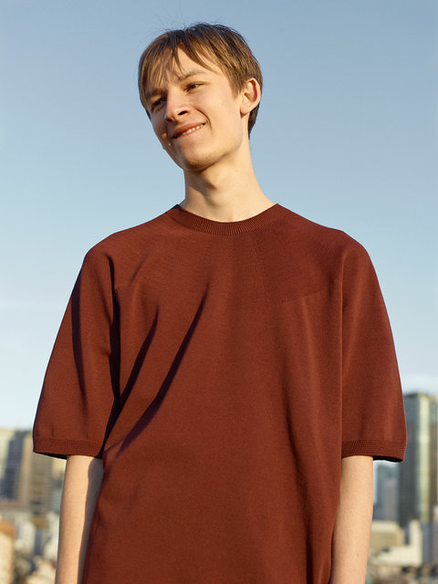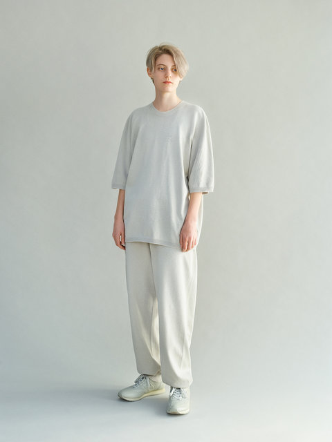 トップスは、リラックス感のあるオーバーサイズニットで、長袖と半袖の2型を用意。伝統的なフォークロアニットの求心テクニックを使って丸みを付けた優しい印象のシルエットが特徴だ。ユニセックスで着用できる。