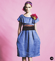 「一番人気の“デニムワンピース”は、インディゴ染めのテンセルデニムをブリーチ加工で色落ちさせた、ほどよいヴィンテージ感が深みのある表情を与えています。フェミニンな襟もとのフリルと、マニッシュなカマーベルトを合わせたコーディネイトが新鮮です。今季コレクションのメインとなるプリントシリーズの“プリントキャミドレス”は、ほどよい光たく感と、薄く柔らかな素材感が、女性らしく優しい印象に仕上げてくれます。そして「MUVEIL WORK」にて展開する“チノパンツ”は、素材・シルエットともに人気が高い! 麻ベルトをポイントに、幅広いコーディネイトが楽しめます」(PR担当 寺井久美子さん)