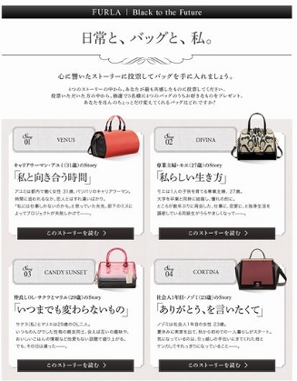 現在フルラのオフィシャルFacebook特設キャンペーンページでは、コレクションを代表する4つのバッグと4人の女性のオリジナルストーリーを展開。バッグとの出会いをきっかけに女性たちが自らと向き合い、少しだけ変わろうとする。そんな姿にどこか自分を重ね合わせ、思わず共感してしまう現代女性の日常を切り取った作品だ。