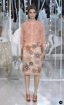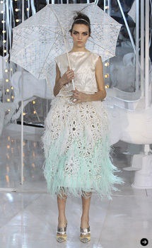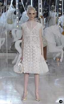 円形のステージを囲むシートに座り、10時きっかりにカーテンが開きました。まぶしいほどにキラキラ光る白馬のメリーゴーランドには透明感溢れるレースのドレスを着たモデルたちが座っています。白レースの上に重ねるシルクオーガンジー。パステルカラーのレースをパッチワークした夢溢れるドレスです。こんな甘いドレス、おとなに似合うかしら? なんて考えてしまうのは野暮というもの。しばしヴィトンランドに遊び、ファッションの魔力を堪能しました。