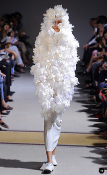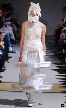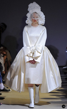 コム デ ギャルソンも真っ白いレースをふんだんに使いました。白サテンドレスの両袖は、大きなリボンで結ばれています。コサージュをいっぱいつけたヴェールをかぶったモデルの顔は見えません。美しい白いドレスの陰に、なぜかお葬式のような悲しいドレスの表情が覗きます。