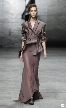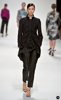 ハイダー アッカーマン。トレンドに左右されることなく、ため息をつくようなコレクションを見せてくれます。1本のベルトで胸もとのドレープを留めて、ボトムスのシルエットをつくる。着付けで決まる着物を思わせます。立体的なパターンに裏付けられたクチュール服のようです。春夏はエスニックなジャカードを使い、シャンブレーの奥行きある光沢を放っています。シャープなエレガンス。ソワレが新鮮です。