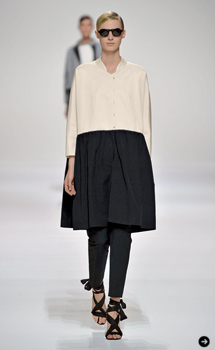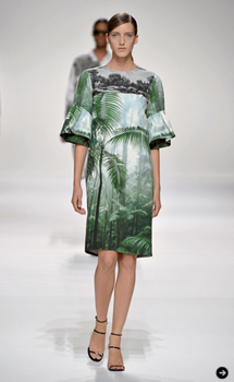 シンプルでゆるい服なのにモードを感じさせるのが、ドリスヴァン ノッテンです。転写プリントにレース、ギャザーのペプラムを使って微妙なバランスをデザインしています。アシンメトリーにハイウエストのベルト、まくり上げるために計算された袖の分量……随所にデザイナーの気配りがのぞきます。リアルでエレガントです。