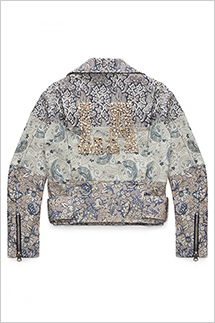 リバティの存在感を引き出し、あえて強いコントラストを生み出すため、チームの3人がペイズリー柄や、和調とアールヌーボーの初期がミックスされたテキスタイルなど、それぞれ好きなプリントをチョイス。アクネ ストゥディオズのクラシックなレザーピースと組み合わせられ、背中にスワロフスキーのクリスタルで“LA”の刺繍をあしらったジャケットやドレスなどが展開される。