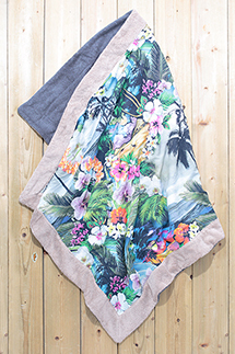 抜群の吸収性と肌触りをもつエジプトコットンを、100パーセント使用した「サン オン ザ ビーチ」のハンドメイドタオル。プリント部分もシルクのような滑らかさと光沢があり、グラフィックも華やかだ
