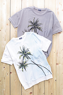 「ジャーナル スタンダード」オリジナルのスウェットTシャツ。南国を感じさせる椰子の木が転写プリントされている。厚みのある生地はタフな質感を備えており、スイムウエアの上から着ても十分な存在感がある