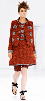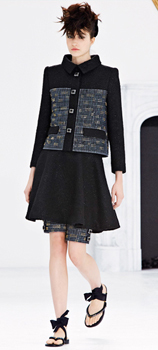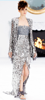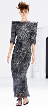 2014年秋冬オートクチュールコレクション。シャネルは20世紀パリのアパルトマンをイメージした一室でした。モノトーンのドレスは、コンクリートで作ったモチーフを、スパンコールやクリスタルと一緒に飾り付けています。リトルドレスにはひざから見えるサイクリングショーツを合わせ、靴はトング。20世紀ココ・シャネルの業績を21世紀のエレガンスにつなげました。
