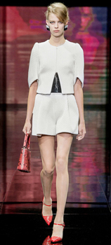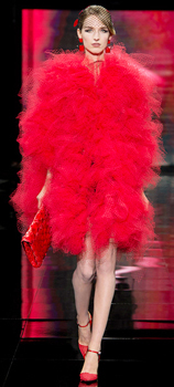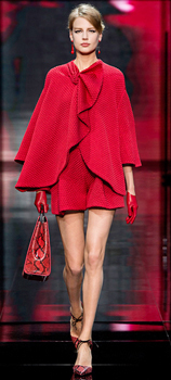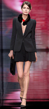 アルマーニ・プリヴェは肩の丸いテーラードジャケットにミニスカートやショートパンツを合わせて若返りました。漆をイメージした赤を差し色に、ソワレでは羽やオーガンジーをふんだんに使いました。