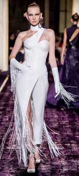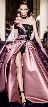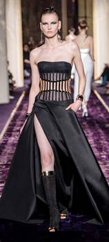大胆なカットとアシンメトリーシルエットの官能的なドレスを並べたのがアトリエ・ヴェルサーチです。大きく開けた胸元、深いスリットのロングスカートは片足だけを覆い、もう一方はむき出しです。エナメルやゴールドのベルト、コルセットがシルエットを強調したセクシーラインはヴェルサーチならではのものです。