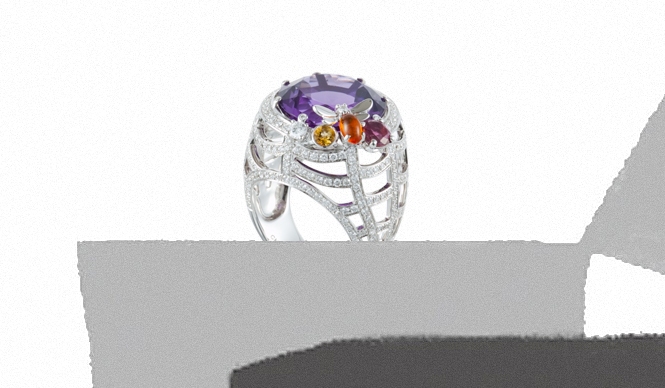 “私をつかまえて…愛しているなら”。そんな囁きが聞こえてきそうな「アトラップ・モワ」コレクションより。クモの巣をモチーフにボリュームたっぷりに作られたリングには、大ぶりのアメシストが輝く。まわりにあしらわれたハチやクモは、まるで愛のダンスを踊っているかのよう。「アトラップ・モワ」リング[WG×ダイヤモンド×アメシスト×シトリン×ピンクトルマリン×ファイヤーオパール×クリソプレーズ]210万円(ショーメ)