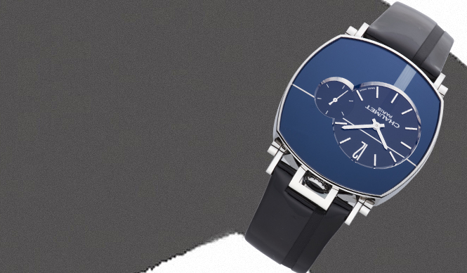 デリケートな深いナイトブルーの光沢をたたえるブラックサファイアガラスに覆われたダイヤルがエレガント。しかし何と言っても特徴的なのは、自動巻き機械式ムーブメントをアシメトリーに取り込み、中心からずれるように2つのカウンターをセットしたこと。これは時を左から右に読み取る、ということを斬新な時計の読み取り方を提案しているのだ。ストラップもエナメルレザーとサテンとを組み合わせたタキシードスタイル。ミニマルなデザインながらもアヴァンギャルドさが薫る。「ダンディ・エディション・アーティ」ウォッチ(自動巻き)94万5000円(ショーメ)