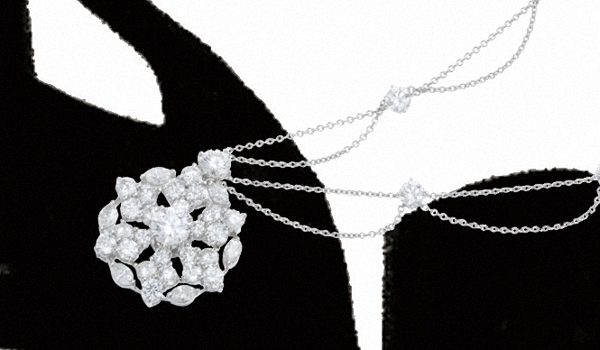 ラウンドカットとマーキーズカットのダイヤモンドを組み合わせて、雪の結晶を表現したファンタジックなジュエリー。チェーンもドレープにラウンドカット・ダイヤモンドをポイントにきかせてフェミニンに。ダイヤモンド・ネックレス[PT×WG×ダイヤモンド]475万円(グラフ/グラフ東京サロン)
