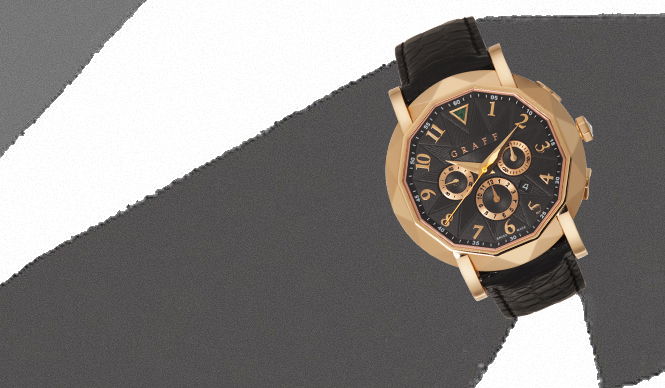 ベゼルのピンクゴールドがまるでダイヤモンドのファセットのようにカットされた、大ぶりのウォッチ。文字盤もカットされたダイヤモンドを上から見たときのようなデザインで、端正かつグラマラスな表情を映し出す。リュウズにあしらわれたダイヤモンド、文字盤のエメラルドなど、ポイントをおさえたジュエルの配置もグラフらしい。ウォッチ(クロノグラフ)[PG]300万円(グラフ/グラフ東京サロン)