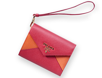 オレンジとレッドのコンビカラーが存在感を発揮するプラダのエンヴェロップ型の財布。封筒を連想させるデザインのミニウォレットはリストレットとしても楽しめる。付属のストラップは取り外しも可能なので、小さなバッグに収納も可能。キズが目立ちにくいサフィアーノレザーは、ヘビーユースする財布にこそ選びたい。