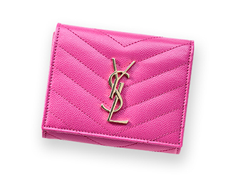 美しいピンクのコンパクトウォレットをサンローランで発見。クラッチにも収納可能なサイズの三つ折り財布は、サンローランのアイコニックカラーである濃厚なフーシャカラーが特徴。時代を超えて愛されるカラーはムッシュ イヴ・サンローランも多用していた。ゴールドのYSLロゴがクラシカルな魅力をさらに加速させる。