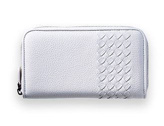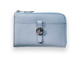ジョルジオ アルマーニからは、エレガントな淡いブルーのラウンドジップ ウォレットを提案。人気素材でもある型押しカーフスキンを使用したこちらは、取り外しコインケース付きで、バッグの大きさによって厚みを調整できるのがうれしい。また、ブランドのロゴをモチーフにした留め具が、洗練されたアクセントを添えてくれる。