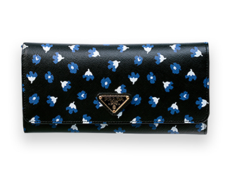プラダのシグネチャーレザーである「サフィアーノ」カーフを仕様された花柄のウォレット。ブラックのベースカラーに春らしいロイヤルブルーのフラワーがあしらわれ、ライニングのブルーが上品な表情を見せる。取り外し可能なチェーン付きのIDカードホルダーが付属し、パスケースとしても使えるのがうれしい。
