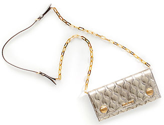 シルバーのメタリックレザーに、ヴィンテージの風合いをほどこし、ユニークな味わいのミュウミュウ。曲線を描くキルティングステッチや、大きなオーバルチェーンが、なんともフューチャリスティックなムードを演出してくれる。ショルダーパットをあしらったチェーンは、使い心地も抜群。光を放つメタリックのウォレットを手に入れ、輝かしい一年を過ごしたい。