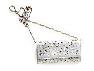 アイコニックなスタースタッズをふんだんに散りばめた、ジミーチュウを代表する人気のウォレットMILLAに、クリスタルスターがくわわった。大小のシルバースターのなかに、小さなクリスタルが女性らしい華やかさを添えてくれる。手に馴染みやすいソフトなゴートレザーの財布には、同じくシルバーのチェーンが付属。ラッキーチャームの星と一緒なら、きっと2015年も素敵な年になりそう。