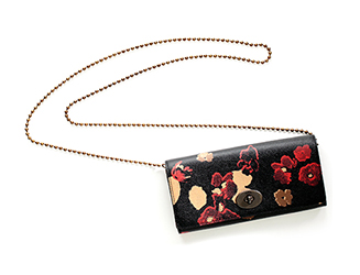 コーチからはブラックレザーにノスタルジックなフローラルプリントをほどこした可憐な財布をセレクトしたい。アイコンともいえるターンロックや取り外しのできるボールチェーンもアンティークカラーに染められ、どこまでもシックな仕上がり。スリムな見た目ながら、アコーディオン状に広がるマチを持たせたファスナーポケットのおかげで、圧倒的な収納力を誇っている。