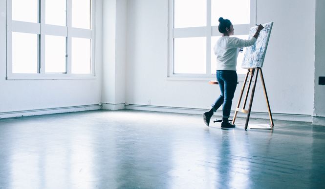 キャンバスにまっさらな白布を張り付けて、迷うことなく、テンポよく描いていくインディゴブルーの図形や直線、そしてドット柄……。取材するスタッフの存在などお構いなしといわんばかりに淀みなく進んでいく作業は、イベントでアーティストのライブペインティングを見ているかのようだ。