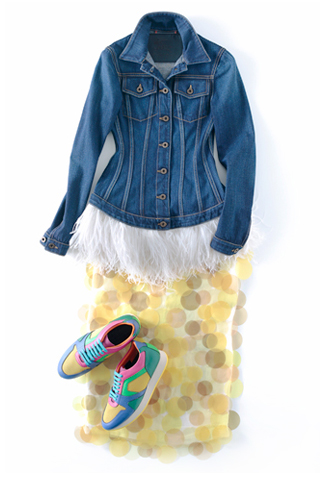 ウエストにフィットする、美しいラインのもつデニムジャケットをトップスとして着こなし、シトラスイエローのミディ丈スカートを合わせて、最旬なスプリングルックに完成。足元はフェミニンかつカラフルなスニーカーで、ヴィヴィッドな差し色を投入。フローラ、レース、カラーブロックなど、女性らしさを取り入れた春先にぴったりなスニーカーで、軽やかにお出かけしよう。