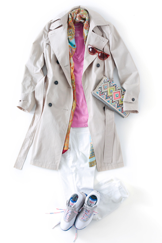 オフの日はリラックスしたムードでお出かけしたい。Tシャツにホワイトデニム、軽やかなトレントコートを羽織ってヌケ感のある着こなしに。エスニックなスカーフやクラッチバッグで鮮やかな色味をプラス。コンサバなコーディネイトにオーセンティックなスニーカーで、今年らしいスポーティなアクセントをそえている。