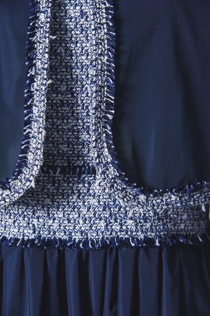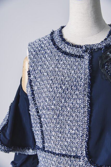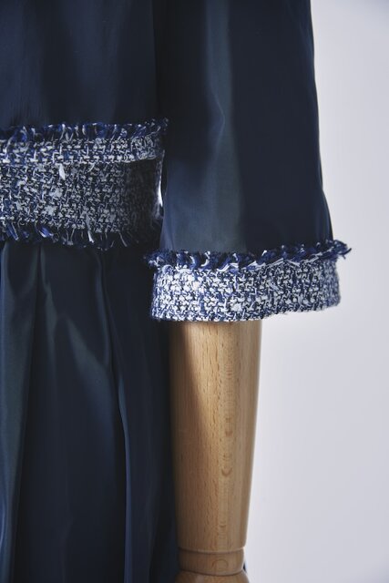 プレステージラインのジャケットとワンピースのセットアップ用には、同社の中でも珍しいファンシーツイードを選定。コットンをベースにしながら、シルクのような光沢と滑らかさを併せ持つビスコースを混紡し、エレガントかつリッチな質感に仕上げた生地をワンピースの身頃とジャケットのトリミングに採用。ボディとなるタフタ生地にもこだわっており、特殊加工した糸を高密度で織り上げ、ほどよいハリ感があるものを採用。そのため、ふんわりとしたシルエットをキープしながら上品な光沢が楽しめる。