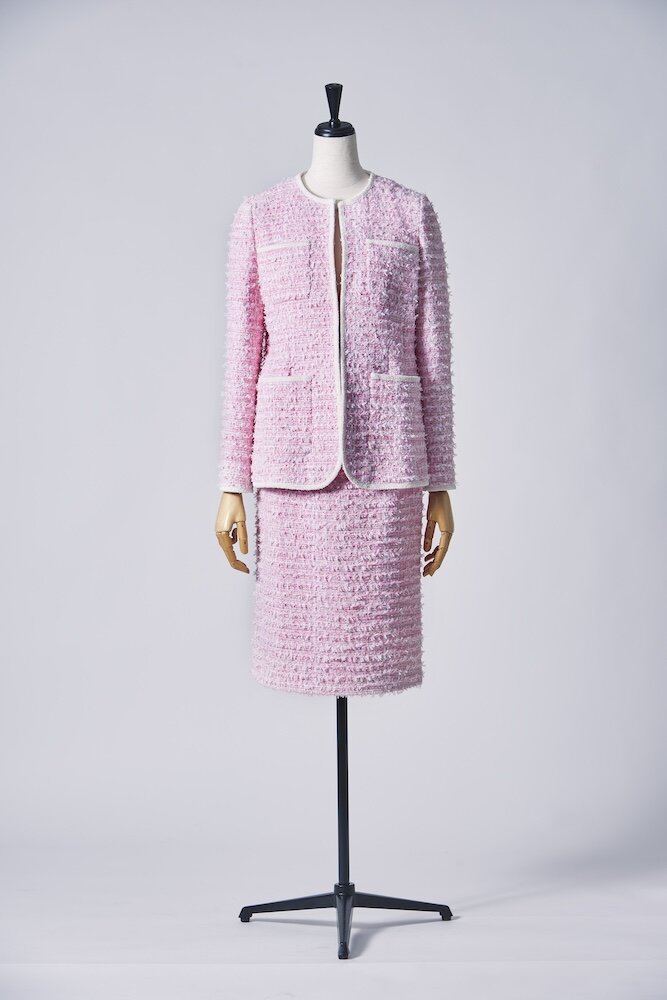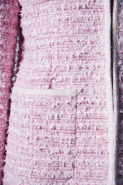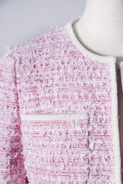 同社から選んだのは、淡いピンクと光沢を放つパッションピンクを組み合わせた“フルッティピンクツイード”。糸そのものが持つ個性を余すことなく引き出し、華やかで存在感のある生地となっている。国内産とも英国産とも一味違う風合いと奥行き感は、やはりフランス人特有の美的感覚と「クラレンソン」の高い技術力があってこそ。このツイードの魅力をさらに引き立てるように、随所のトリミングにはラメを入れ込んだ特別なレーヨンモールを使い、煌めきを加えているのも見逃せないポイント。