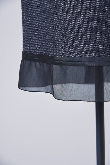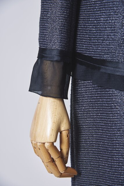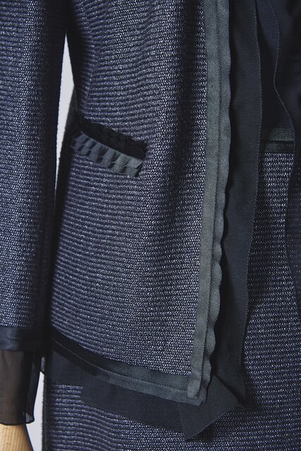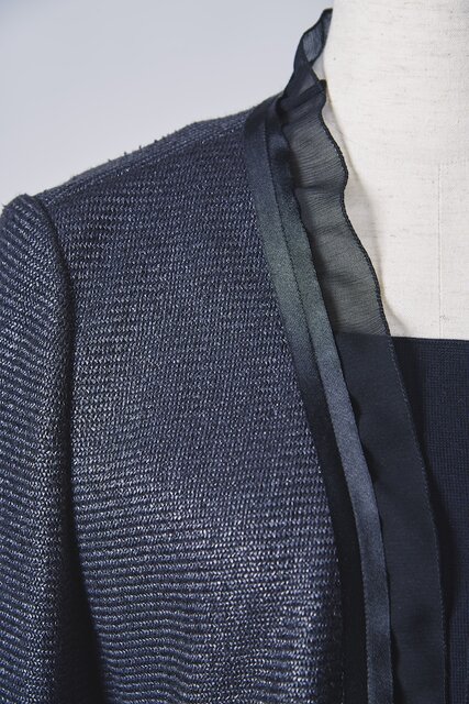 トリミング部にはジャージー素材とのマッチングを熟慮して薄いサテンテープを選択。バイアスカットによって端始末を省き、軽快な仕上がりに。さらに、ジャケットの前合わせと袖口、スカートの裾にあしらったシフォンは、縫い代が細く収まる三巻千鳥で縫い合わせている。これらの難易度が高い縫製をいくつも経て生み出された本作は、まさに逸品と呼ぶに相応しい。