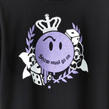 戸田 今回このスマイルモチーフを使ったステッカーも作ったんです。これは3周年記念という意味もありますが、前々からステッカーは作りたいと思っていたんですよね。今回このスマイルのモチーフが本当によかったので、最初はこれひとつだけのつもりだったんです。でもせっかく3周年なんだから、ということでブランドロゴやナイトスカルといったブランドを代表するモチーフを入れました。いつものピンクとブルーを基調にしたスマイルモチーフは、クラウンのイエローが効いててとても気に入っています。