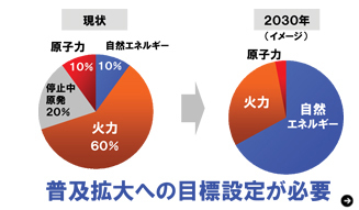 自然エネルギーの普及を阻んでいる壁の最大のものはせっかく作った自然エネルギーによる電力が自由市場に出て行かないこと。発送電の分離や自然エネルギーによる電力の買い取り制度の普及により、自然エネルギーに価格競争力をつける。いまは高価でも、20年後に安全で安いエネルギーを使うために自然エネルギーの普及拡大を図る。これは結果的に日本のエネルギーの自給率を高めることにもなり、国家の安全保障にも有利に働く。