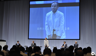 この日のイベントはこの財団の創設者である孫正義設立者(ファウンダー)の基調講演、財団の理事長としてヘッドハンティングされた、自然エネルギーの先進国 スウェーデンの元エネルギー庁長官 トーマス・コバリエル代表理事、そして理事である末吉竹二郎(国連環境計画SEFI特別顧問)、飯田哲也(環境エネルギー政策研究所所長)、村沢義久(東京大学総長室アドバイザー)の各氏による、それぞれの専門分野からの財団での取り組みを紹介するという構成。