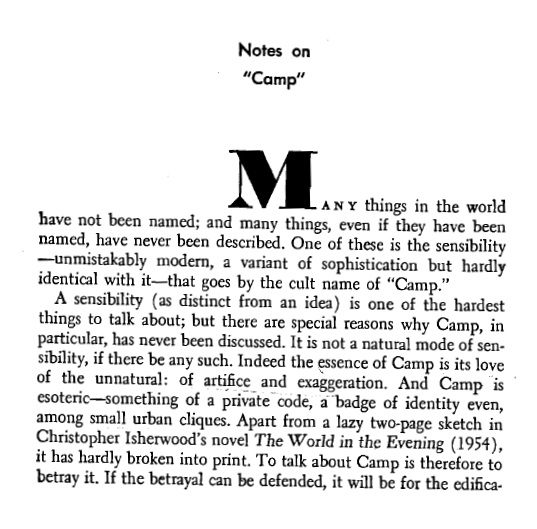 「白鳥の湖」やグレタ・ガルボのことを、ソンタグは「キャンプ趣味にとって真摯な崇拝の対象」としている。