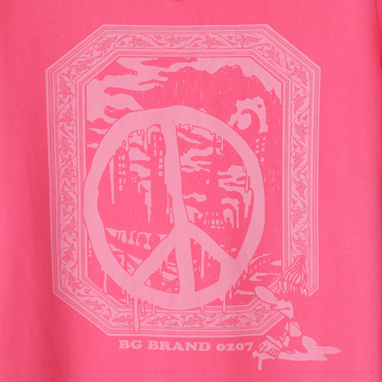 額縁に飾られた環境汚染をイメージさせる絵画に、“イタズラ君”が大きくピースマークを落書きしちゃうんです。平和を願う想いを遊び心のあるイラストでポジティブに表現しました。遠目にはカモフラージュ柄のようでしょう? でも、じつはよく見るとメッセージが……というカラクリが仕掛けられていると。