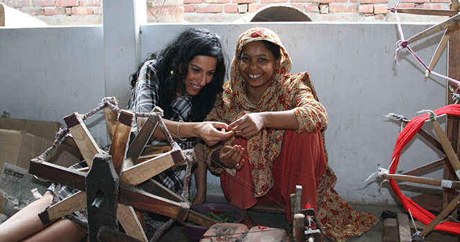 バングラデシュのフェアトレード団体で糸巻きの作業を行う女性とサフィアさん。民族衣装をまとい、伝統的な木製の糸巻き器を使ってゆっくりと糸を巻いていく。©People Tree