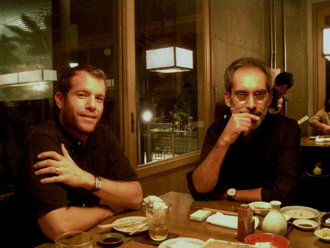 左がDr.ロマネリで、右がMr.ヤン。行きつけの蕎麦屋 山都にて。レンズを向けると、自然とハイ・ポーズ!