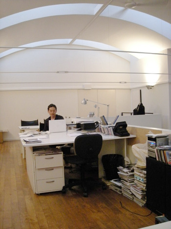 ミラノコレクションの本番が終わって数日後、わたしはジュリアーノ フジワラのデザインオフィイスを訪ねました。デザイナーの松村正大クンとはすでに東京でご飯など一緒にしていたので気心知れた間柄。まだ20代ということもあり、どうも後輩、というか弟のように接してしまう、わたしではあります(笑)。そうさせるのも、彼自身が、いろんなことから学びたい! という真摯な姿勢の人であり、とびきり自然体ゆえ。こういう人には、わたし、イロイロと世話したくなっちゃうんですよね。で、デザインオフィスは、そんな彼の人柄を表わすような、機能的で飾り気のないファクトリーの様相。