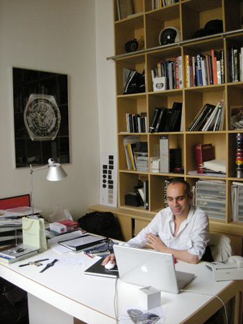 彼の頭のなかのアイデアをひっくり返したような、そんな表現がピッタリな彼の部屋にはミリタリーのヘルメットや計器、軍やデザイン、建築の参考文献や写真集などが本棚から溢れてアチコチに散らばっていて。積み重ねられた本の間からナニやら無造作に引っ張り出してくるや「あっ、コレ。次の時計のプロトタイプね。どう思う、AKI?」なんて(笑)。こういうラフな感じも、相変わらずブルーノ流でした。