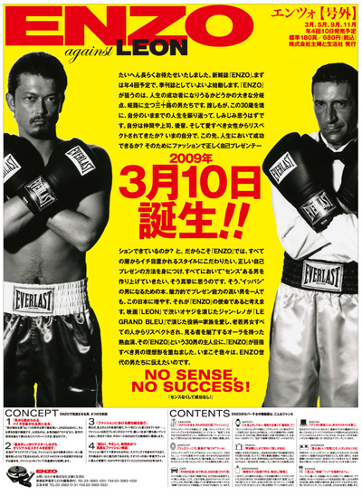 こちらは新雑誌『ENZO』のタブロイド版。広告代理店さんやクライアントさん用に号外用としてつくったモノです。イメージは"ウォホール VS バスキア 対決の図"からインスパイアされて、の"EWAN VS ジローラモ 対決の図"。