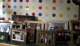1階の壁には大小さまざまな黄金の鏡が飾られ、その対面の暖炉上にはダミアン・ハースト「AUROTHIOGLUCOSE」、おびただしい数のエルトン・ジョンやエリザベス女王など多くのセレブリティとの写真。
