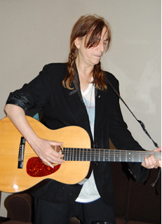 インタビューも終わりにさしかかったころ、おもむろにギターを手にし「グレイトフル」(アルバム『ガン・ホー』収録)と即興の替えうた、そして「マイ・ブレイキアン・イヤー」(『トランピン』収録)を披露してくれたパティ。
