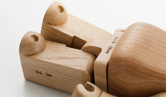 そのチャーミングな姿にくわえて、それぞれに異なる木目を眺めるだけでも大変おもしろく、木の表情の豊かさに改めて気づかされる。木肌には日本語と英語で樹種名が表記されている。木の温もりを伝え、木への親しみを深めることから、大人はもとより、小さな子どもの木育にも役立てられそうだ。