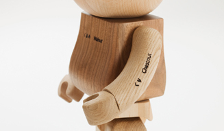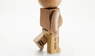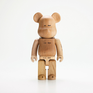 木製BE@RBRICKの製造においては信頼の高い、家具ブランド「カリモク」とコラボレーションのもと、北海道から7樹種の かんばつ材—ブナ、クルミ、サクラ、クリ、ナラ、キハダ、カエデを調達。顔、腕、胴体、足とパーツごとに異なる樹種が使われた、ユニークなBE@RBRICKが誕生した。